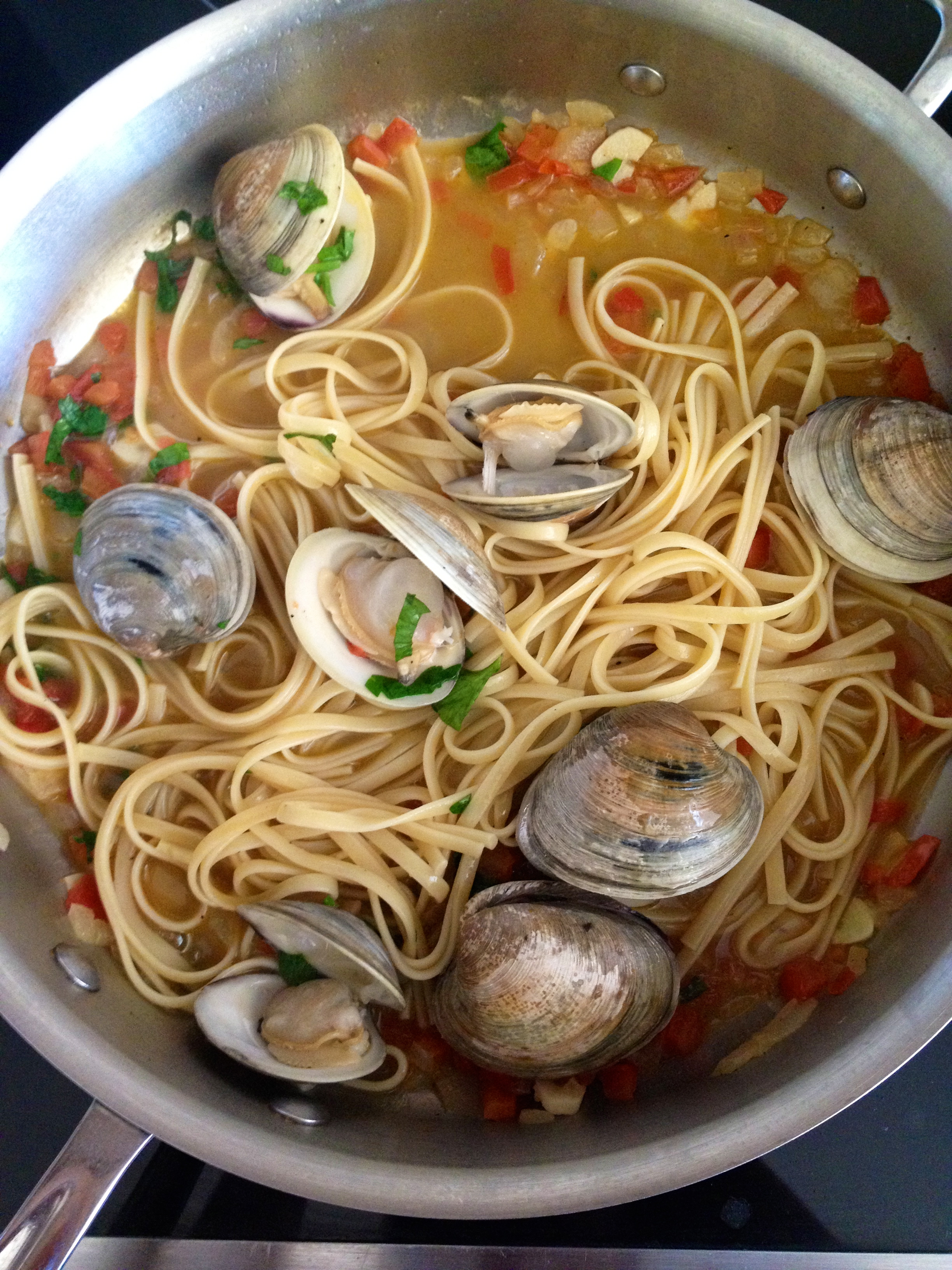 Next, add your clams and cover the pan. Let them steam without lifting the cover for about 5-6 minutes. When you uncover it, the clams should all be open. If any are still closed, discard them. Add the chopped parsley and the pasta, toss to coat. Be sure to not rinse your pasta under water after cooking because this will get rid of their natural starch which will slightly thicken your sauce. Season with salt and pepper to taste.