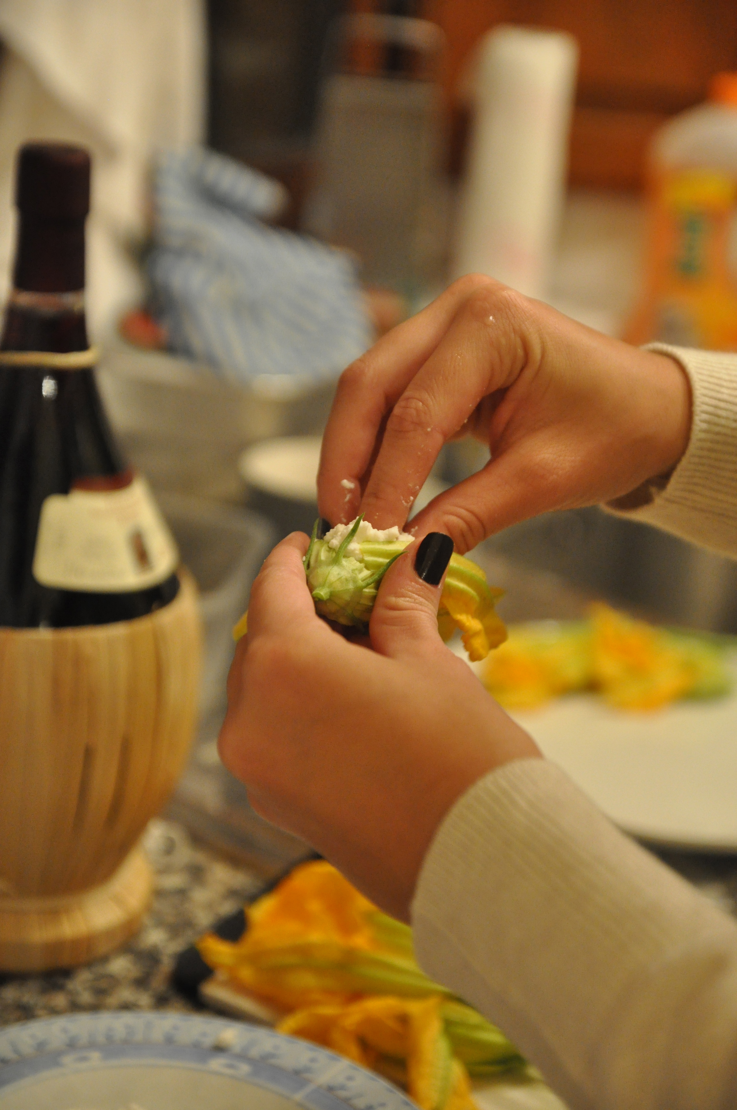 In a small bowl, combine the ricotta, garlic, parm, nutmeg, lemon zest, with salt & pepper to taste. Gently put a scoop of ricotta in each flower and gently close the tops to ensure your ricotta will not fall out.