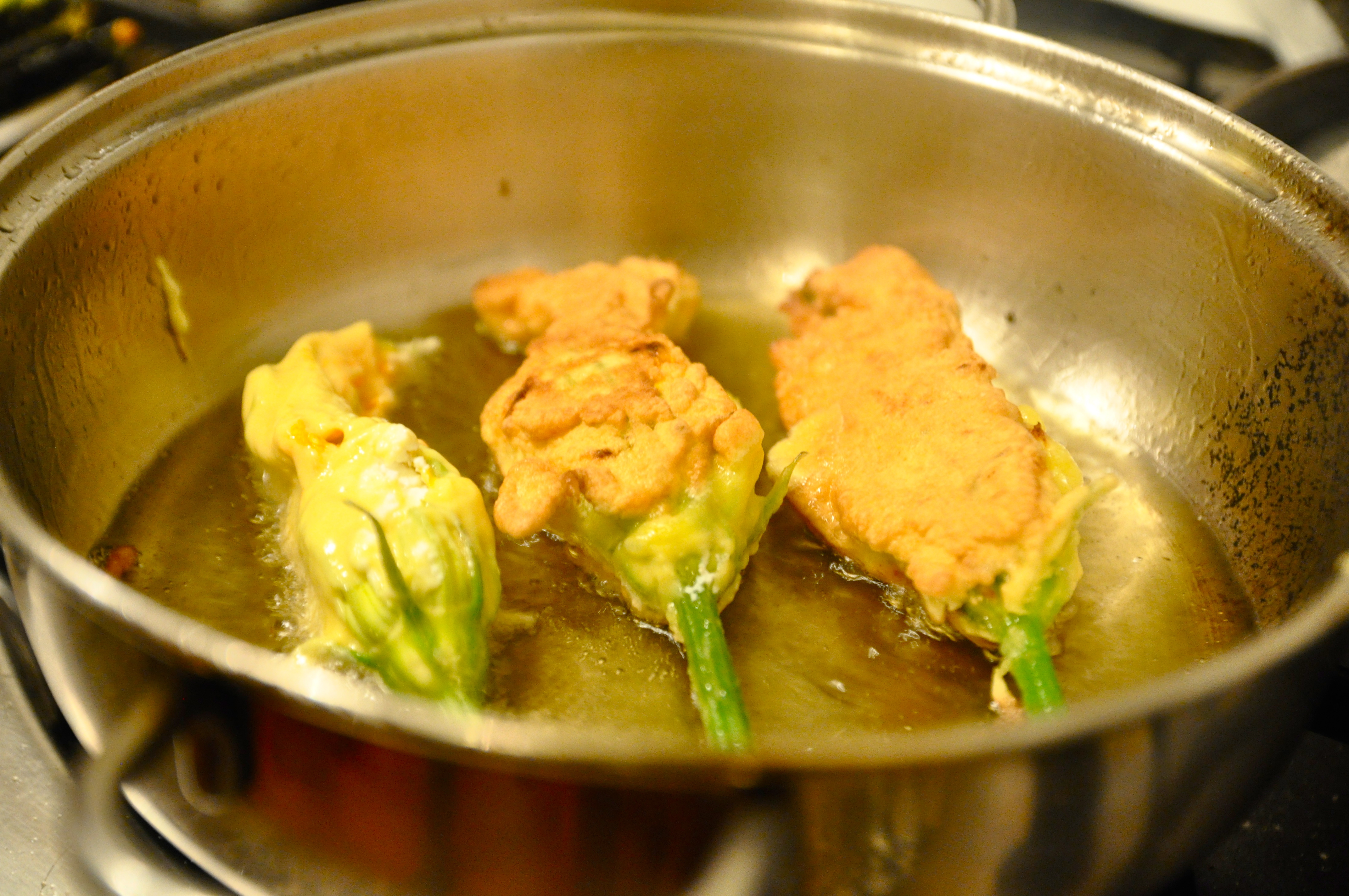 Heat the oil in a frying pan over medium high heat. Once the oil is very hot, coat a flower in the batter and fry. Be sure not to overcrowd the pan as this will lower the temperature of the oil. Place the cooked flowers on a plate over paper towels to soak up the extra oil. Sprinkle with a little more salt, freshly squeeze lemon, a little parm, and serve right away.