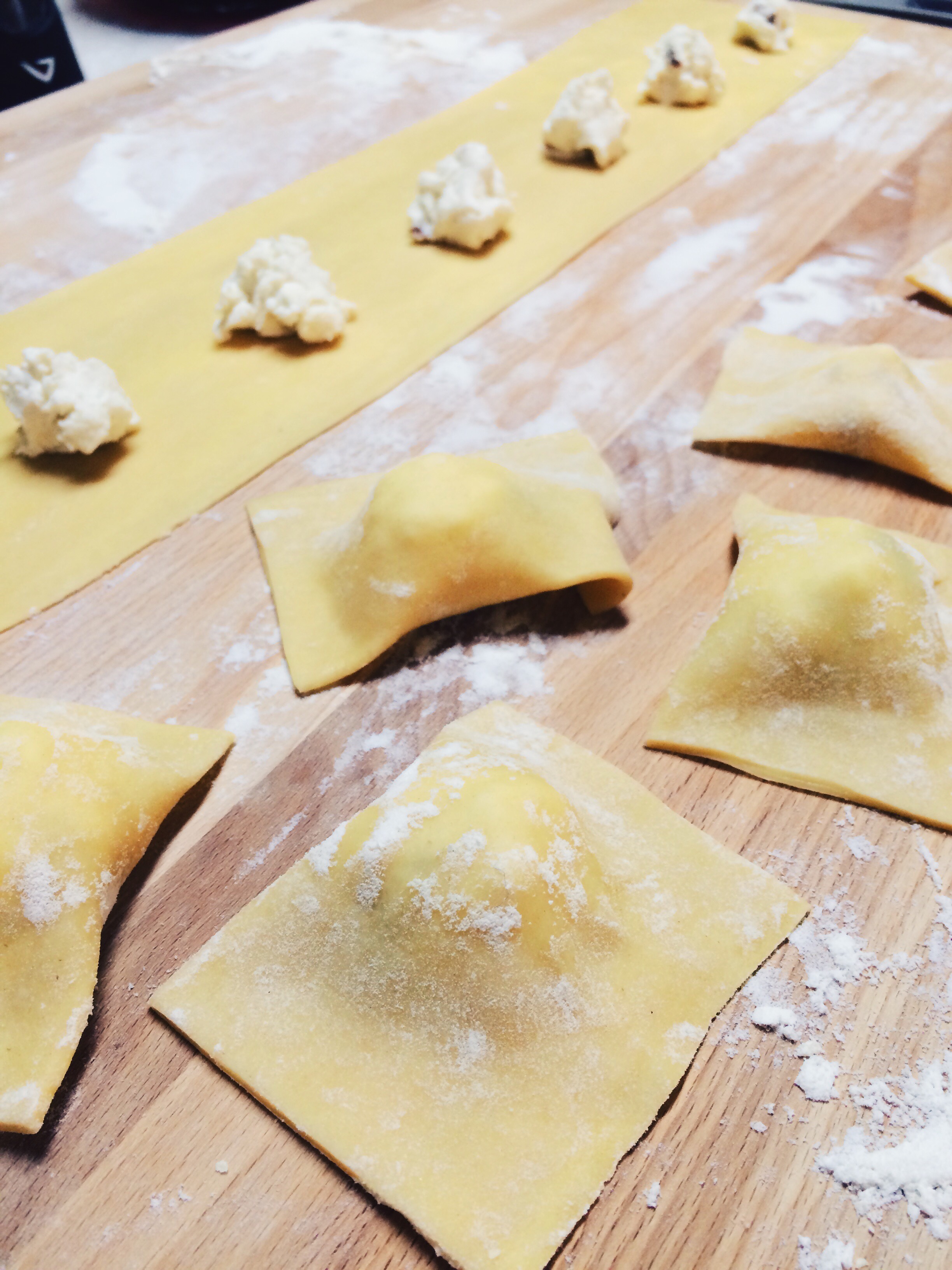 Ravioli:After the dough has rested for a full half hour, divide it in half. Form each half into rectangles, and place through a pasta roller attachment on a Kitchenaid Mixer or a traditional manual pasta roller. Keep rolling it on each setting until you are on setting 6, which you should start to be able to slightly see through the dough to your hand. Then, place a small scoop of the filling along the bottom half of the dough sheets. (See picture above). With the remainder of the egg you used, create an egg wash by adding a spritz of water and mixing it well with a fork in a small bowl. Using your finger, put the egg wash around the bottom 3 edges of the dough where you will fold it over. Fold over the pasta dough and seal the edges. Cut the ravioli and cook in boiling water for about 3 minutes. They will not take long to cook because of their freshness. Once the start to float, let them cook for about 1 minute longer. Then toss in the sauce and enjoy! Buon appetito!Goat Cheese Ravioli with White Wine Sauce