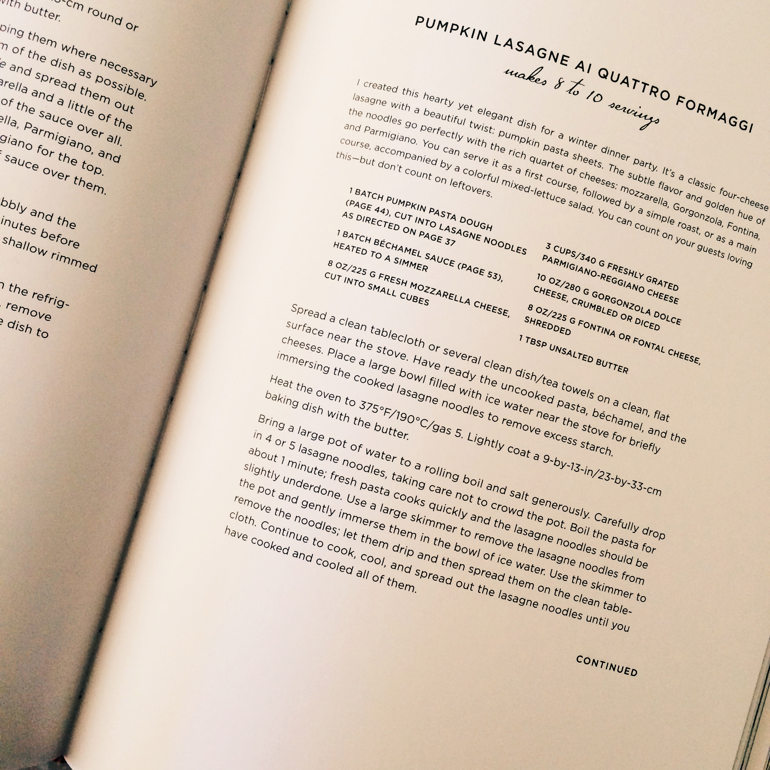 A beautiful combination of seasonal fall flavors and classic italian comfort. This is what comes to mind as you bite into a fork full of creamy, fresh pumpkin lasagna with four cheese bechamel from Domenica Marchetti’s words. This is a recipe sure to please any picky dinner party guest or husband alike. The fresh pumpkin incorporated in the dough showcases the ingredient in a way that is not too heavy, but rather light. It genuinely melts in your mouth as your teeth cut through the layers of pasta and sauce. This is a classic in my household after making it only one time, and many times to come. ❤