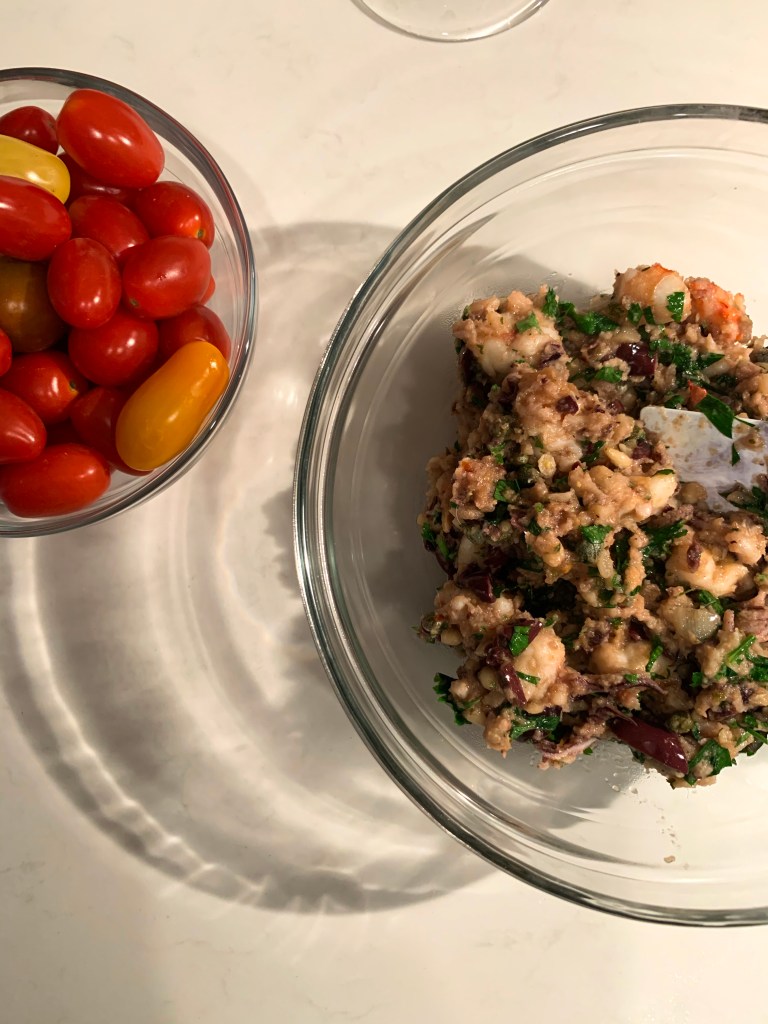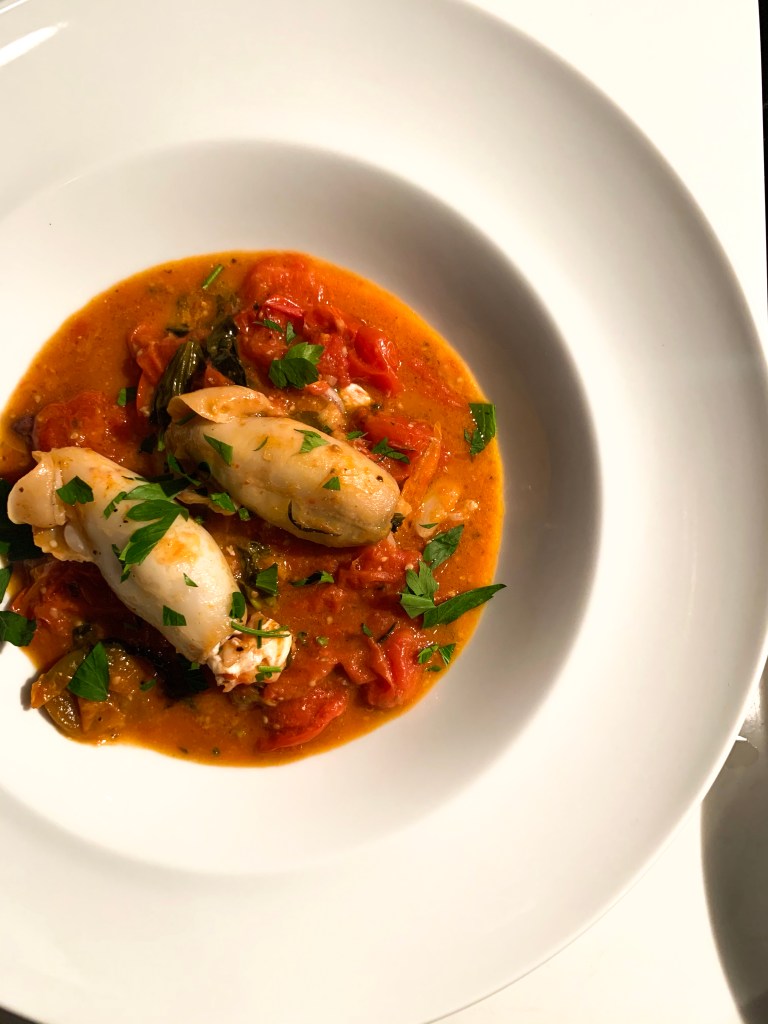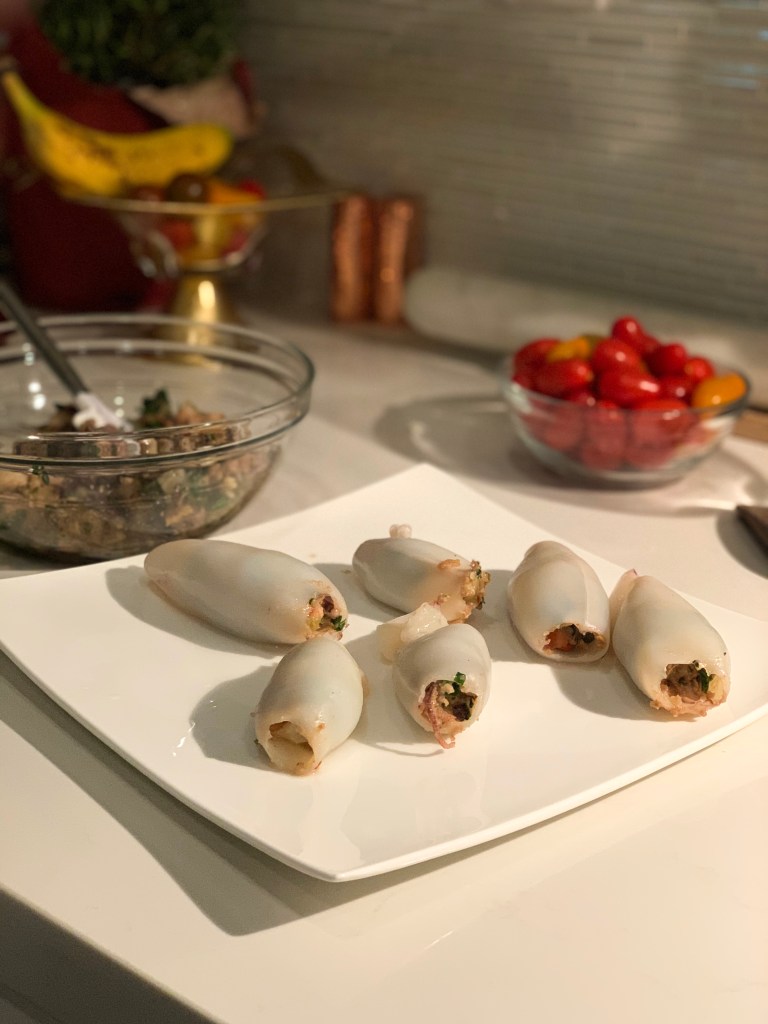 A traditional Italian dish, tubes of squid stuffed with many scrumptious flavors like anchovies, pine nuts, capers, olives, and more seafood. You’ll often see dishes heavy on seafood in coastal areas like Sicily and Naples–as much of their society circles around it. After much research of the many different ways to make it, I’ve settled on what I believe is the perfect combination of delicate flavors. If you’re making this dish for a special occasion like Christmas Eve, save some time by prepping the filling the night before and refrigerating overnight. Then the day of, all you have to do is stuff them, make a little sauce, cook the calamari and enjoy!
