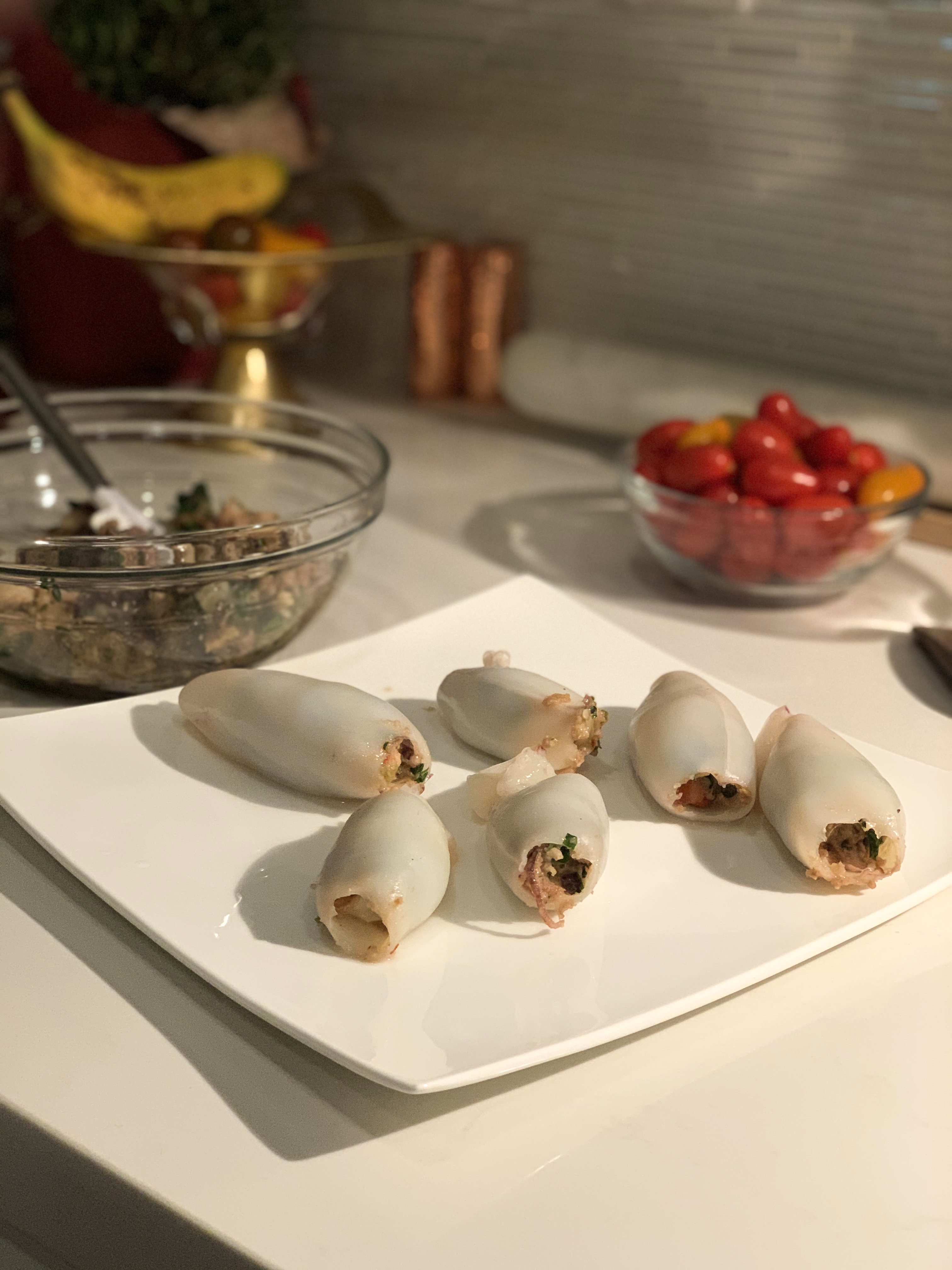 A traditional Italian dish, tubes of squid stuffed with many scrumptious flavors like anchovies, pine nuts, capers, olives, and more seafood. You’ll often see dishes heavy on seafood in coastal areas like Sicily and Naples–as much of their society circles around it. After much research of the many different ways to make it, I’ve settled on what I believe is the perfect combination of delicate flavors. If you’re making this dish for a special occasion like Christmas Eve, save some time by prepping the filling the night before and refrigerating overnight. Then the day of, all you have to do is stuff them, make a little sauce, cook the calamari and enjoy!