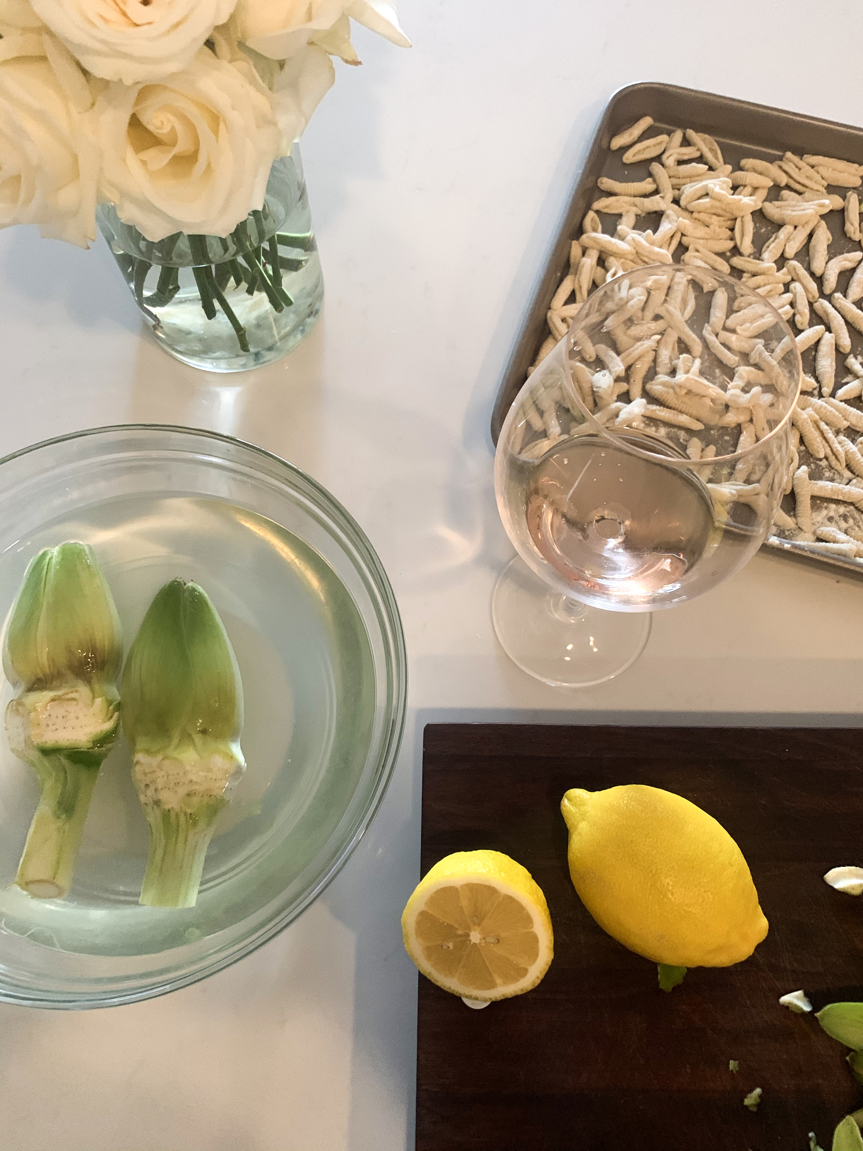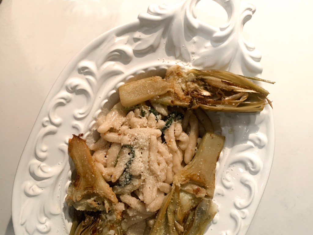So once the Christmas holiday rush had passed, I was yearning to put it to use, but craving something a little healthier and lighter. I instantly thought of artichokes with pasta–the last meal I ate during my last visit to Rome, with a crispy Roman style “carciofi alla giudia” aka Jewish artichokes from Rome–rounding out the dish to perfection. I put my own spin on it, rather than a heavy red sauce, making it light and fresh with lemon and white wine, finished with some starchy pasta water and pecorino cheese for a healthy but decadent sauce.